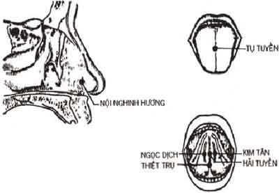 Ở chỗ gốc lưỡi, chỗ hình chữ thập với gân chính giữa dưới lưỡi. (H.128)