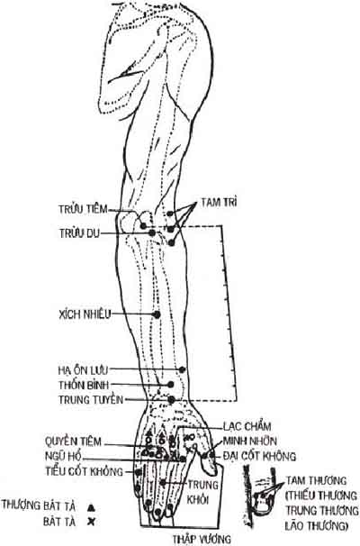 Âm uỷ 3: Ở đầu chót ngoài nếp gấp hố khuỷu lên 3 thốn