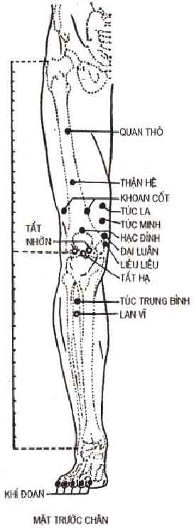 Co đầu gối, lấy ở dưới xương bánh chè chỗ lõm cạnh ngoài gân nối và cạnh trong